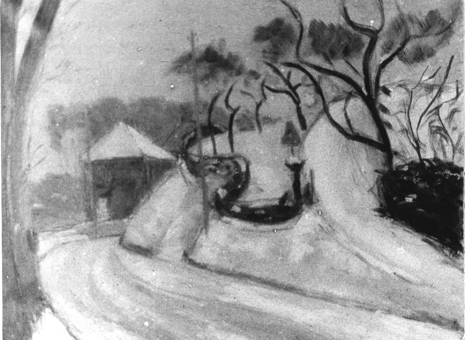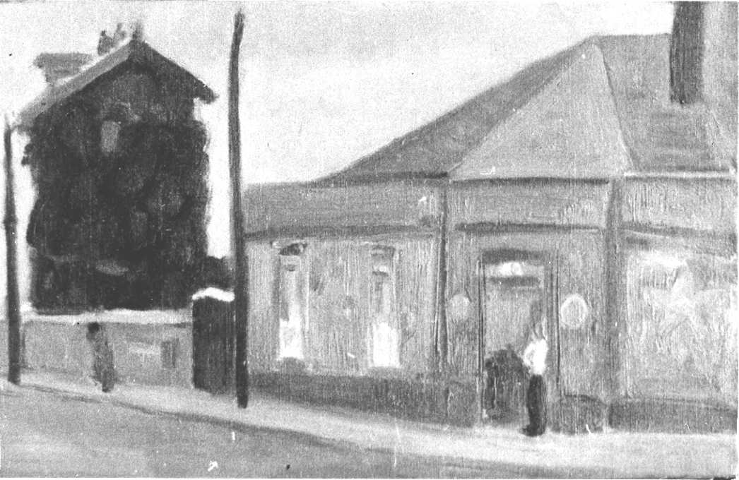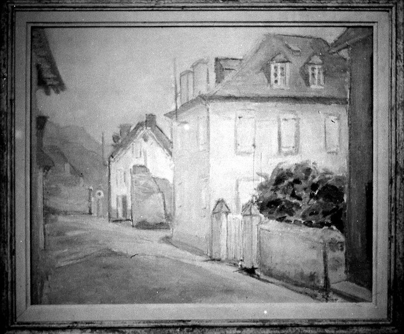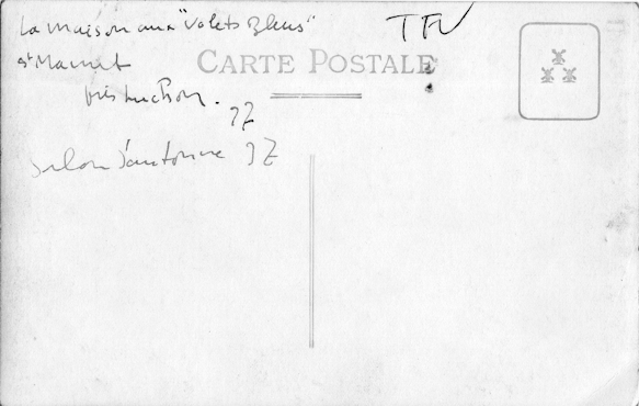 T. F.-V. Tableau extrait d'une carte postale N&B 9x14 cm. Titre (?) : La maison aux "volets bleus", non signée, 1936-1937.