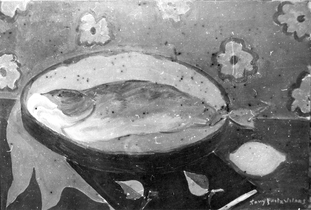 T. F.-V. Nature morte au poisson, signée Tony Fritz Vilars en bas à droite, circa 1936-1938.
