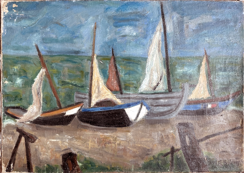 T. F.-V. Barques à Yport, signée Tony Fritz-Vilars en bas à droite, non datée (après 1945).