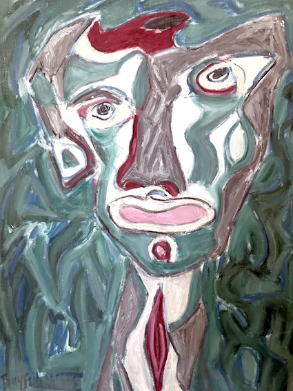 T. F.-V., Visage aquatique rouge vert, huile sur toile, 73x54 cm,