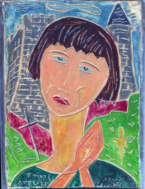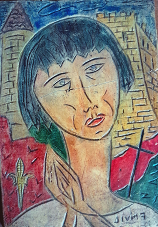 T. F.-V., Jeanne d’Arc sur le bûcher, céramique, 95 X 85 cm, signée en bas à gauche (démontage délicat), 1957.