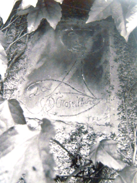La Groseillière, gravure et dessin sur une ardoise (?) scellée sur un mur, dimensions (à venir), signée TFV en bas à droite, non datée.
