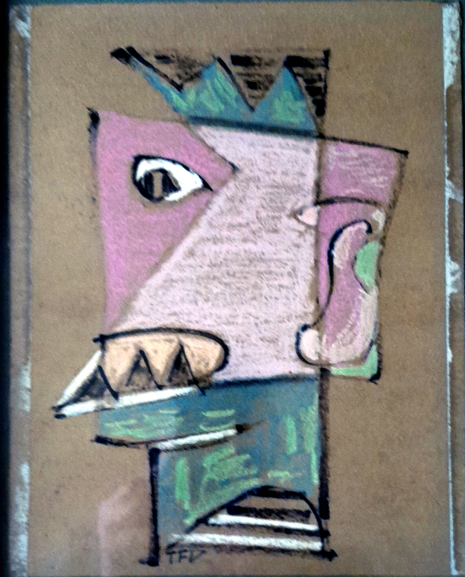titre, technique mixte (feutre, crayon, pastel) sur carton, 22x28 cm, signé TFV sous le dessin à gauche, 1975.