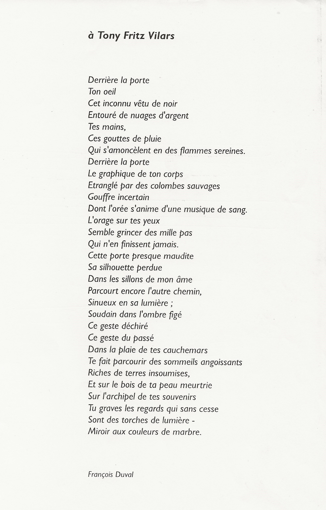 à Tony Fritz Vilars, poème de François DUVAL, 1975.